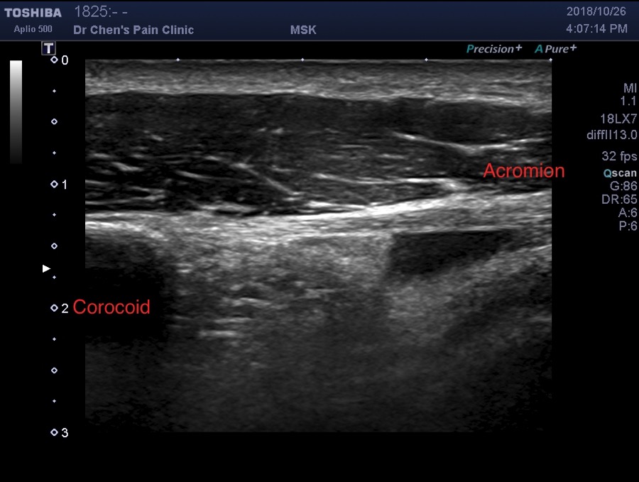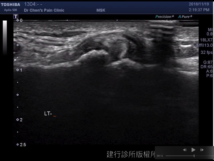 這是一個慢性肩膀疼痛的患者。(錄影)超音波影像顯示為退化性的尖峰鎖骨關節炎