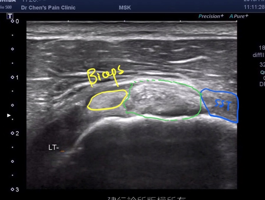 可以見到二頭肌因為脊上肌肌腱斷裂造成二頭肌往內移動,以及二頭肌肌腱明顯腫大發炎的現象